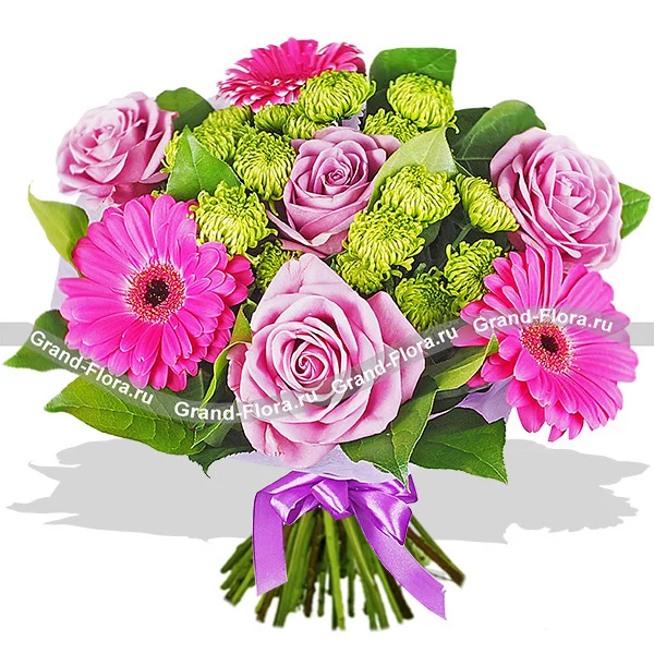 Великолепное сочетание элегантных розовых роз, ярких малиновых гербер и зеленых кустовых хризантем выгодно подчеркнуто салалом и упаковкой из фетра.